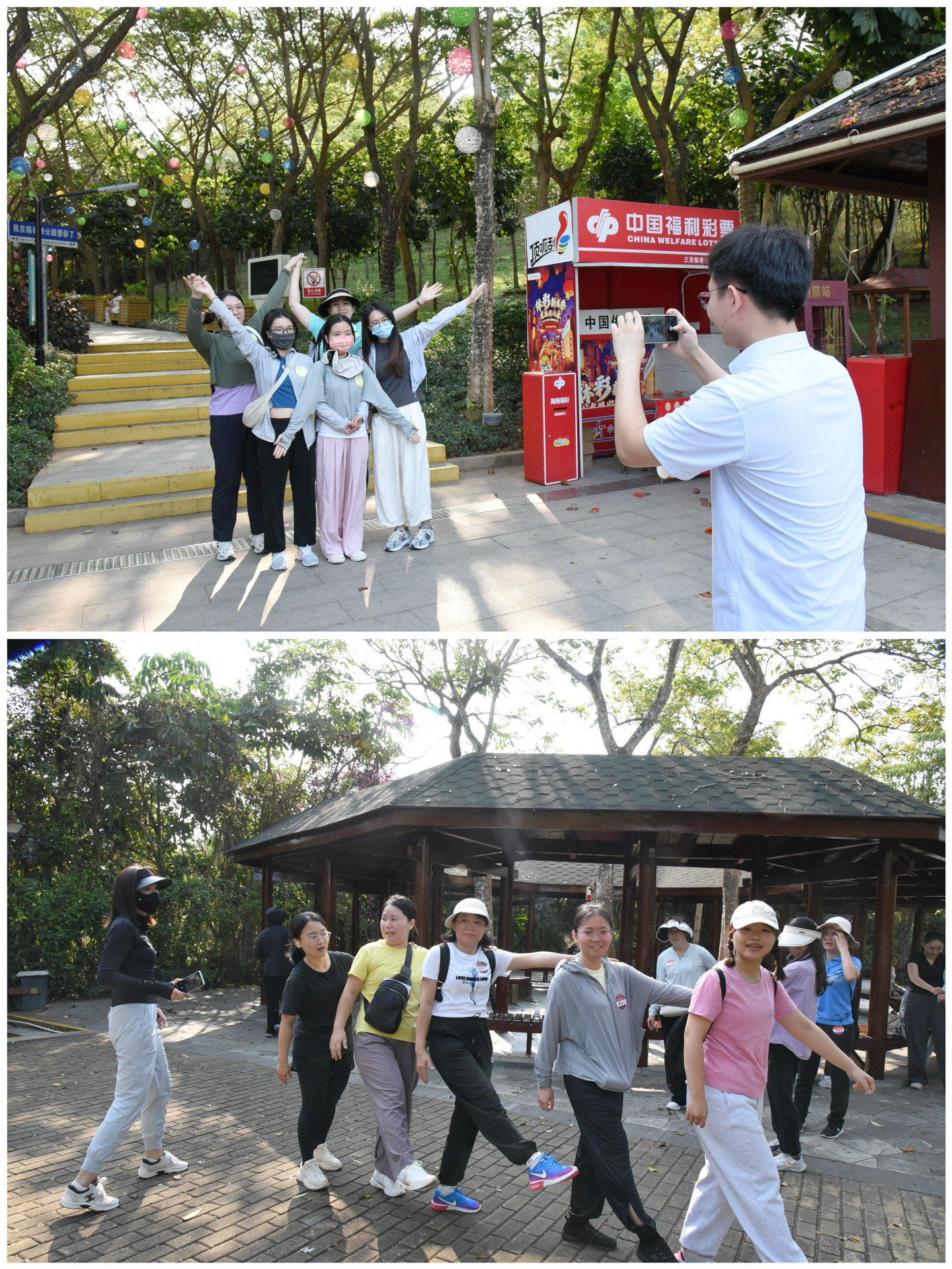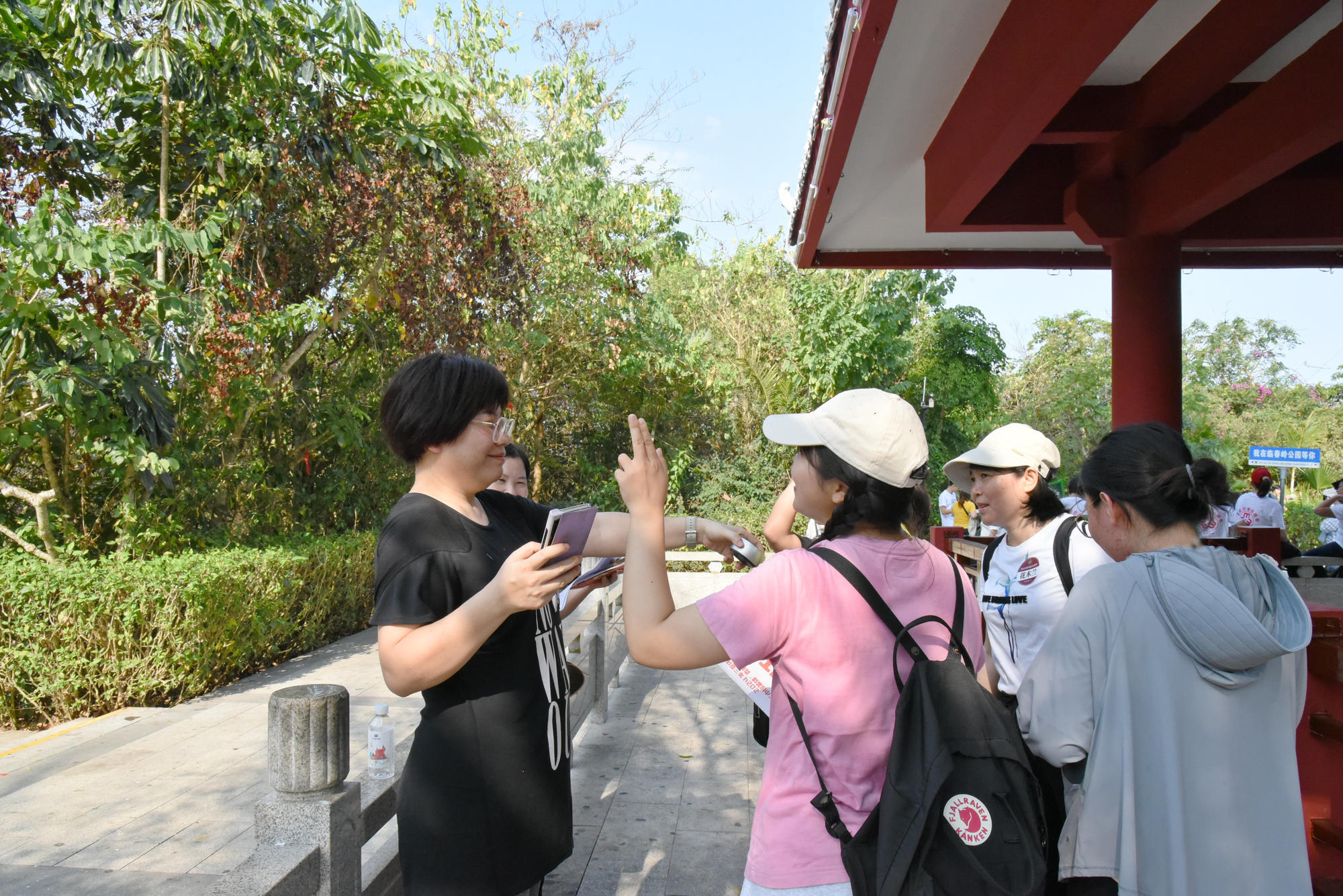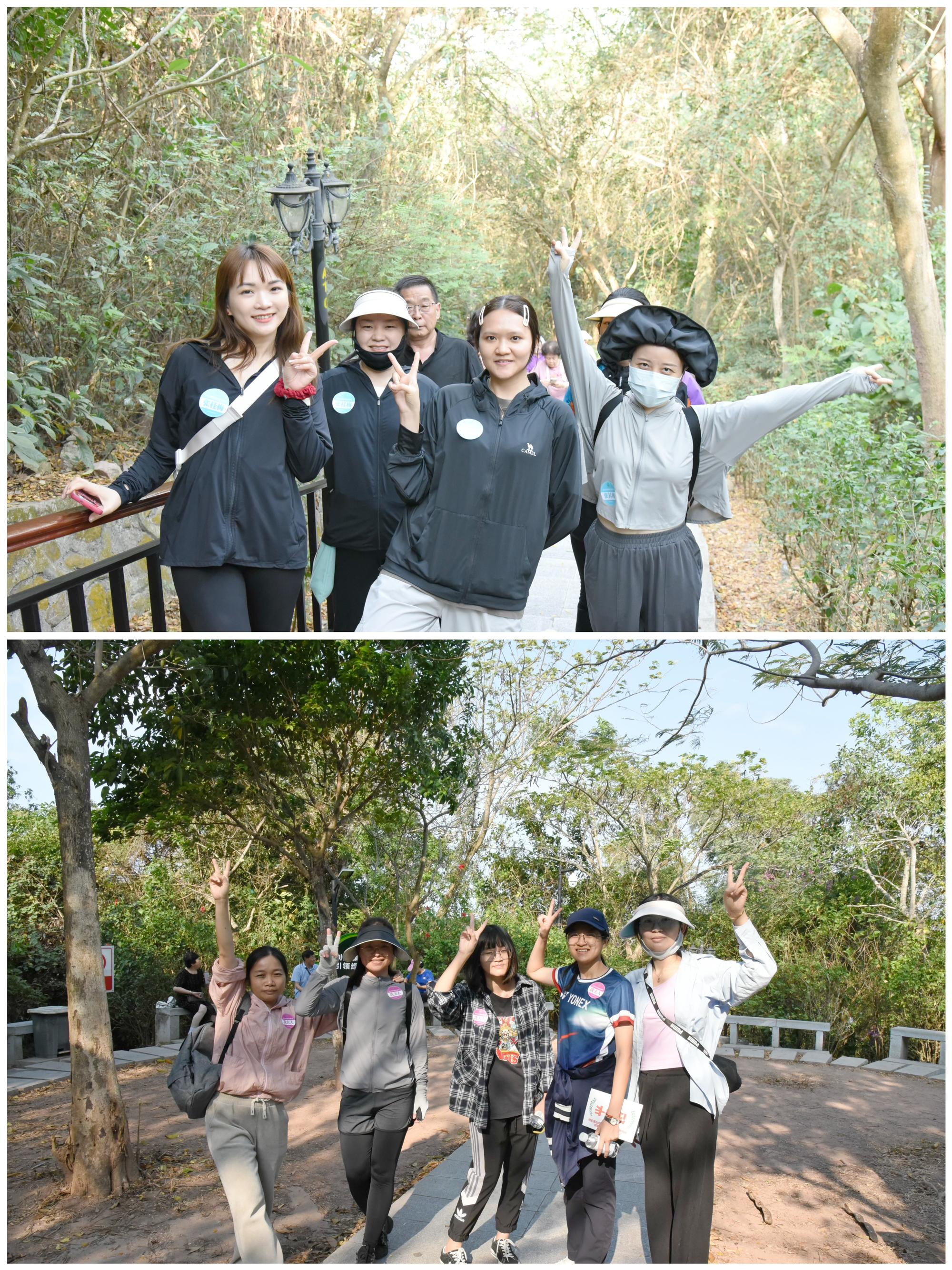 登山途中,各小組要根據(jù)任務(wù)卡內(nèi)容,在指定地點按照規(guī)定動作擺出相應(yīng)姿勢并拍攝合照。“五人手拉手比‘星’”“橫排側(cè)身齊步走”無論是簡單的動作還是有難度的姿勢,各種各樣的造型大家都能輕松駕馭,紛紛在入口處、茶亭和瞭望塔留下趣味合照,很快闖關(guān)成功,迎接下一步挑戰(zhàn)。