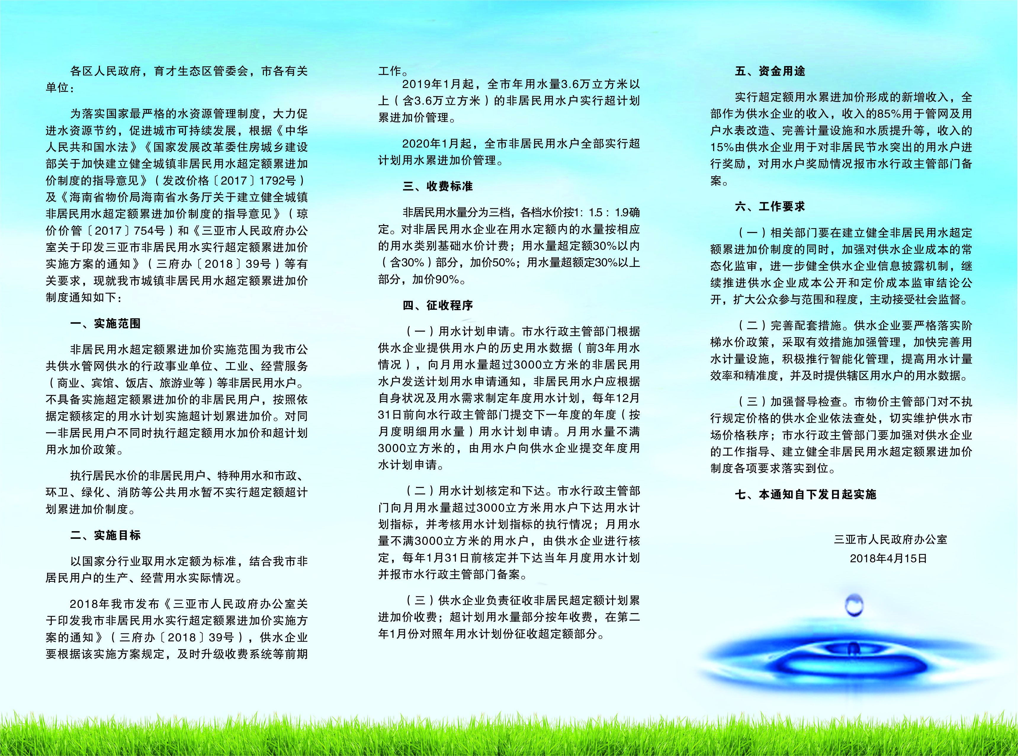 三府辦〔2018〕91號(hào) 關(guān)于印發(fā)三亞市非居民用水實(shí)行超定額累進(jìn)加價(jià)制度到通知