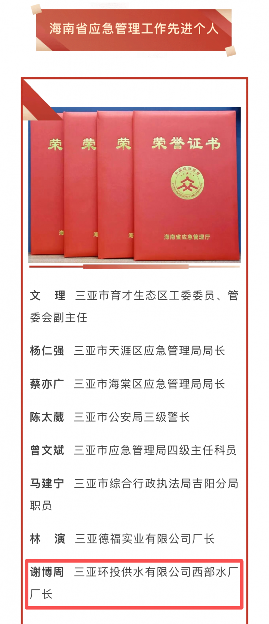 近日,海南省應(yīng)急管理廳公布全省應(yīng)急管理工作先進(jìn)集體和先進(jìn)個(gè)人名單,對(duì)在全省應(yīng)急管理領(lǐng)域作出突出貢獻(xiàn)的集體與個(gè)人予以表彰。其中,三亞環(huán)農(nóng)集團(tuán)旗下三亞環(huán)投供水有限公司西部水廠廠長(zhǎng)謝博周榮獲“海南省應(yīng)急管理工作先進(jìn)個(gè)人”稱號(hào)。