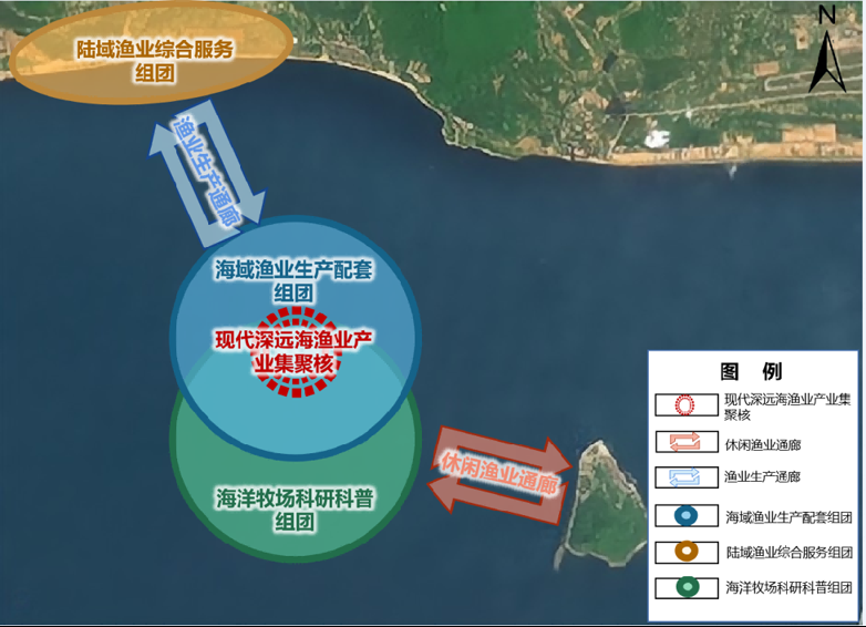 △ 三亞海上現(xiàn)代漁業(yè)產(chǎn)業(yè)園“一核心-兩通廊-三組團(tuán)”規(guī)劃布局