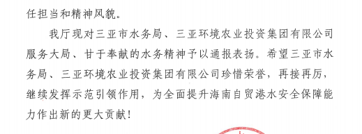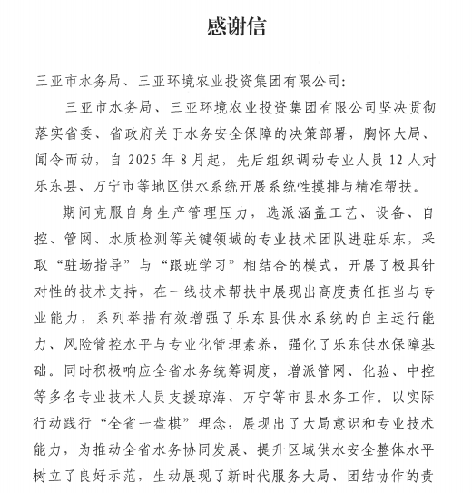 近日,省水務廳向三亞環(huán)農集團發(fā)來感謝信,對集團在支持樂東等市縣供水技術提升、積極響應全省水務調度安排中作出的貢獻給予高度肯定。信中指出,三亞環(huán)農集團堅決貫徹全省水務工作部署,統(tǒng)籌指導下屬單位落實對口支援任務,以實際行動踐行“全省一盤棋”理念,為強化區(qū)域供水保障、推動全省水務事業(yè)協(xié)同發(fā)展樹立了榜樣。